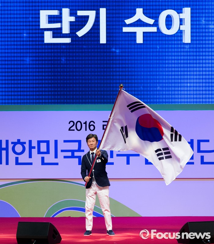 (서울=포커스뉴스) 19일 오후 서울 송파구 올림픽공원 올림픽홀에서 열린 2016 리우올림픽 대한민국 선수단 결단식에서 정몽규 대한민국 선수단장이 단기를 수여 받고 흔들어보이고 있다.