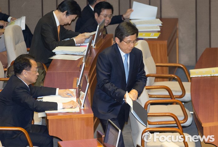(서울=포커스뉴스) 19일 오후 서울 여의도 국회에서 열린 344회 국회(임시회) 1차 본회의, 사드(THAAD·고고도미사일방어체계) 배치에 대한 긴급현안질문에 참석한 황교안 국무총리가 답변을 위해 단상으로 향하고 있다.