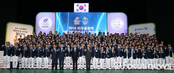 (서울=포커스뉴스) 19일 오후 서울 송파구 올림픽공원 올림픽홀에서 열린 2016 리우올림픽 대한민국 선수단 결단식에서 선수단이 기념촬영을 하고 있다.
