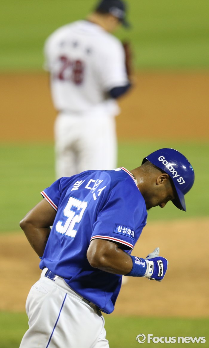 (서울=포커스뉴스) 19일 서울 잠실구장에서 열린 2016 프로야구 삼성-두산 경기 6회초 2사 만루에서 삼성 발디리스가 두산 장원준으로 부터 볼넷을 얻어내 밀어내기 동점 타점을 올리고 있다.