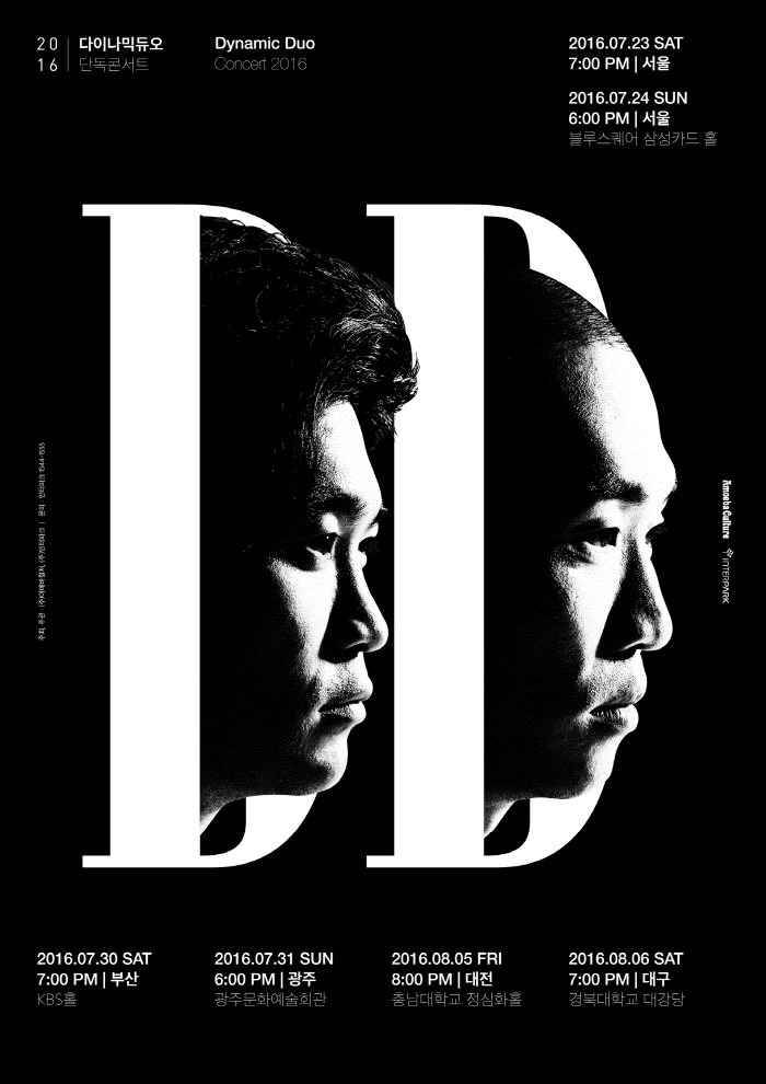 한편 다이나믹듀오는 오는 23, 24일 서울 블루스퀘어를 시작으로 30일 부산 KBS홀, 31일 광주 광주문화예술회관을 거쳐 8월 5일 대전 충남대학교, 6일 대구 경북대학교까지 총 5개 도시 6회 대규모 전국 투어를 개최한다.오는 23, 24일 양일간 서울 블루스퀘어에서 개최될 ‘2016 다이나믹듀오 단독 콘서트–서울’ 콘서트에 김범수, 제시, 빈지노가 게스트로 출연한다. 사진은 공연 포스터. <사진제공=아메바컬쳐>