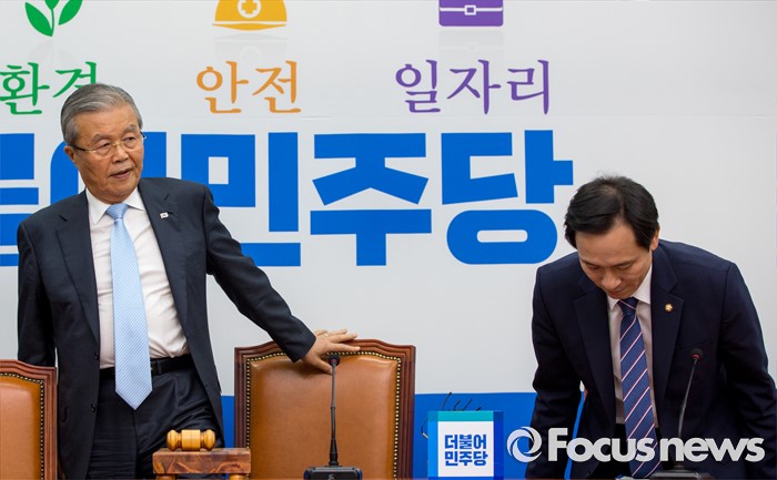 (서울=포커스뉴스) 김종인(왼쪽) 더불어민주당 비상대책위 대표와 우상호 원내대표가 20일 오전 서울 여의도 국회에서 열린 비상대책위원회의에 참석하기 위해 회의실로 들어서고 있다.