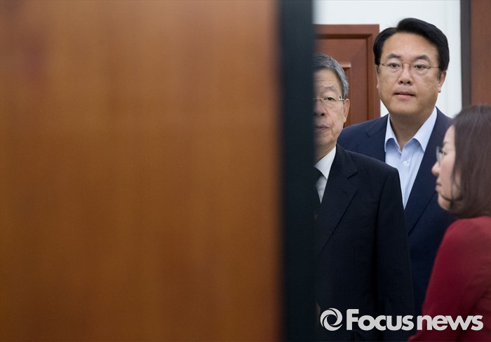 (서울=포커스뉴스) 20일 오전 서울 여의도 국회에서 열린 새누리당 혁신비상대책위원회의에 김희옥 위원장과 정진석 원내대표가 참석하고 있다.