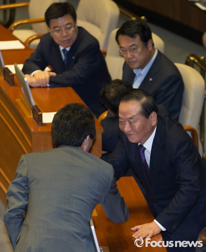 (서울=포커스뉴스) 20일 오전 서울 여의도 국회에서 열린 344회 국회(임시회) 2차 본회의, 사드(THAAD·고고도미사일방어체계) 배치에 대한 긴급현안질문에 참석한 서청원(오른쪽), 유승민 새누리당 의원이 인사하고 있다.