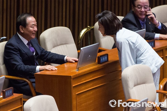 (서울=포커스뉴스) 새누리당 8.9 전당대회 불출마를 선언한 서청원(왼쪽) 의원이 20일 오전 서울 여의도 국회에서 열린 344회 국회(임시회) 2차 본회의, 사드(THAAD, 고고도미사일방어체계) 배치에 대한 긴급현항질문에 참석해 나경원 의원과 대화 하고 있다.