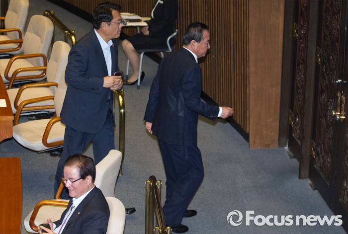 (서울=포커스뉴스) 20일 오전 서울 여의도 국회에서 열린 344회 국회(임시회) 2차 본회의, 사드(THAAD·고고도미사일방어체계) 배치에 대한 긴급현안질문에 참석한 정진석(왼쪽) 새누리당 원내대표와 서청원 의원이 대화를 위해 이동하고 있다.