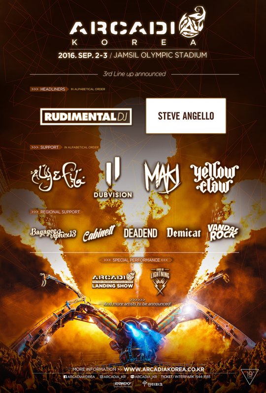 또한 테크노 기반의 드럼앤베이스 장르로 국내외 디제이 경연대회서 우승한 한국 언더그라운드의 자존심 '바가지 바이펙스써틴'과 자신들만의 스타일로 존재감을 나타내고 있는 '데드엔드', 세련된 사운드로 누디스코의 신성이라 불리우는 '캐비닛'이 참석한다. 이밖에도 개성 강하고 트렌디한 디제이들이 '아카디아 코리아'에서 3차 라인업에 포함됐다.