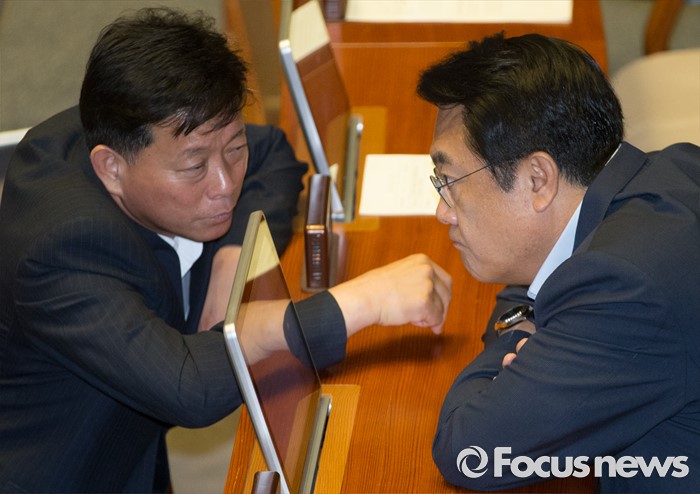 (서울=포커스뉴스) 20일 오전 서울 여의도 국회에서 열린 344회 국회(임시회) 2차 본회의, 사드(THAAD·고고도미사일방어체계) 배치에 대한 긴급현안질문에 참석한 정진석(오른쪽) 새누리당 원내대표와 김명연 의원이 대화하고 있다.