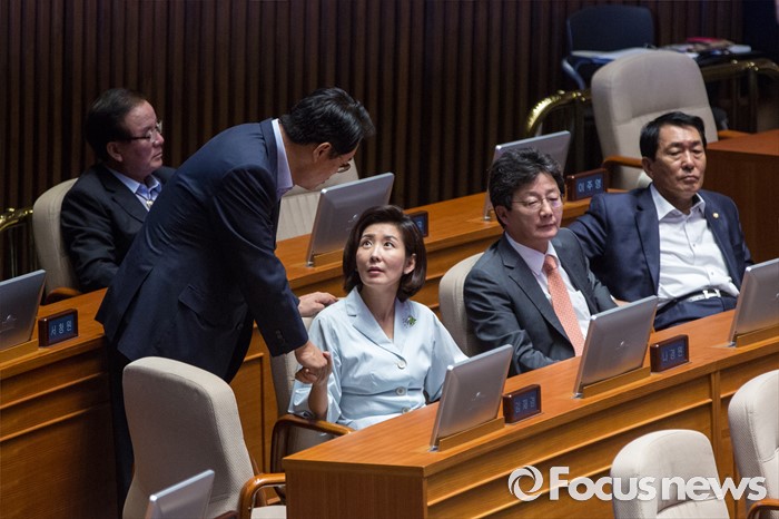 (서울=포커스뉴스) 정진석(왼쪽) 새누리당 원내대표와 나경원(가운데) 새누리당 의원이 20일 오전 서울 여의도 국회에서 열린 344회 국회(임시회) 2차 본회의, 사드(THAAD, 고고도미사일방어체계) 배치에 대한 긴급현안질문에 참석해 대화 하고 있다.