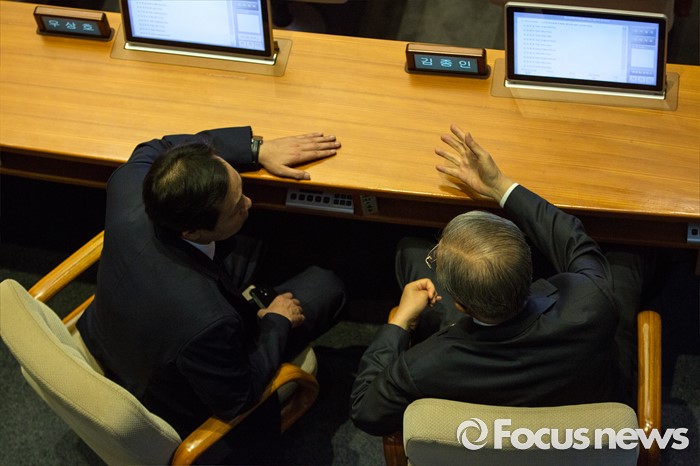 (서울=포커스뉴스) 김종인(오른쪽) 더불어민주당 비상대책위 대표와 우상호 더불어민주당 원내대표가 20일 오전 서울 여의도 국회에서 열린 344회 국회(임시회) 2차 본회의, 사드(THAAD, 고고도미사일방어체계) 배치에 대한 긴급현안질문에 참석해 대화 하고 있다.