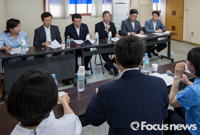 (서울=포커스뉴스) 20일 오전 서울 중구 남대문지역상담센터에서 김희옥(뒷줄 왼쪽 네번째) 새누리당 혁신비대위원장이 지역사회복지활동가들과 대화하고 있다. 김 위원장은 이날 간담회를 마친 후 남대문 쪽방촌을 방문, 여름철 무더위 대비와 주민보호대책 마련을 위한 민생행보를 이어갔다.