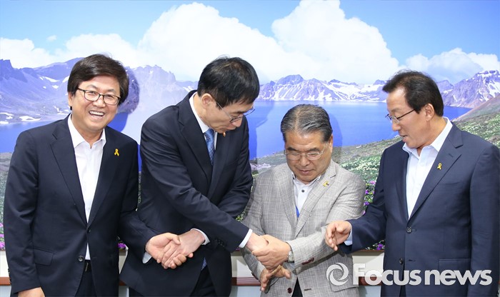 (세종=포커스뉴스) 이준식 사회부총리 겸 교육부장관이 20일 오후 세종시 정부세종청사 교육부 접견실에서 새롭게 구성된 전국시도교육감협의회 회장단과 간담회를 갖기 앞서 악수를 하며 기념촬영하고 있다. 왼쪽부터 최교진 세종시교육감, 이준식 부총리, 이재정 협의회장, 민병희 강원도교육감.