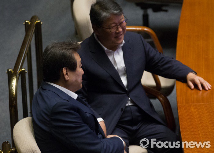 (서울=포커스뉴스) 20일 오후 서울 여의도 국회에서 열린 344회 국회(임시회) 2차 본회의, 사드(THAAD·고고도미사일방어체계) 배치에 대한 긴급현안질문에 참석한 김무성(왼쪽), 조원진 새누리당 의원이 대화하고 있다.