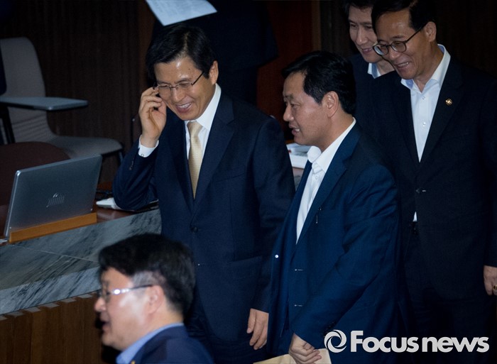 (서울=포커스뉴스) 20일 오후 서울 여의도 국회에서 344회 국회(임시회) 2차 본회의, 사드(THAAD·고고도미사일방어체계) 배치에 대한 긴급현안질문이 산회된 후 황교안 국무총리가 김관영 국민의당 원내수석부대표 등과 함께 퇴장하고 있다.
