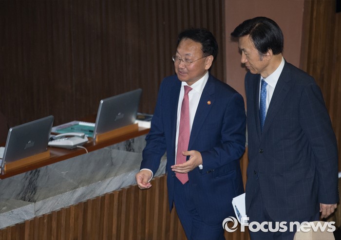 (서울=포커스뉴스) 20일 오후 서울 여의도 국회에서 344회 국회(임시회) 2차 본회의, 사드(THAAD·고고도미사일방어체계) 배치에 대한 긴급현안질문이 산회된 후 유일호(왼쪽) 경제부총리 겸 기획재정부 장관과 윤병세 외교부 장관이 대화하며 퇴장하고 있다.