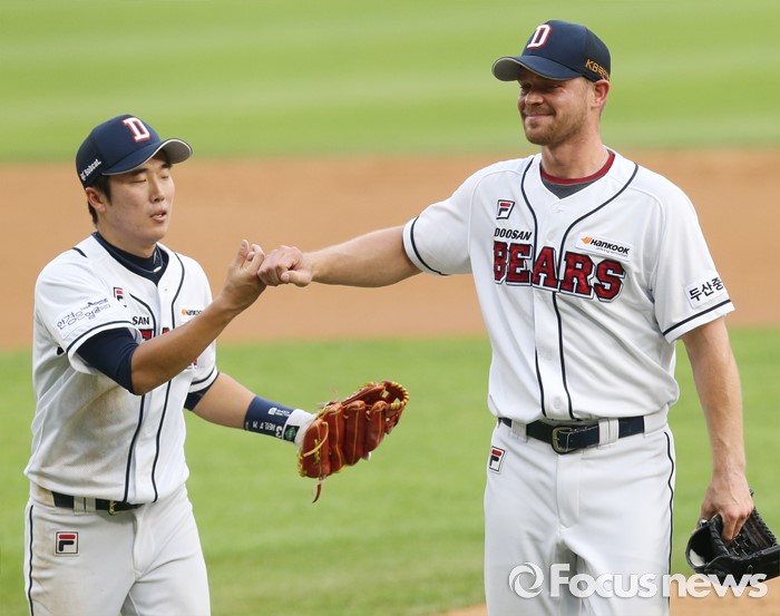 (서울=포커스뉴스) 20일 서울 잠실구장에서 열린 2016 프로야구 삼성-두산 경기에서 두산 선발 보우덴이 2회초 수비를 마치고 더그아웃으로 들어가는 허경민과 주먹을 마주치고 있다.