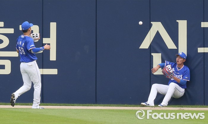 (서울=포커스뉴스) 20일 서울 잠실구장에서 열린 2016 프로야구 삼성-두산 경기 1회말 삼성 우익수 우동균이 두산 박건우의 외야플라이를 잡아 펜스에 기댄채 중견수 박해민에게 볼을 건네고 있다.