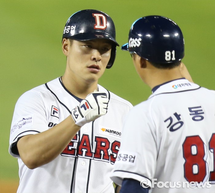 (서울=포커스뉴스) 20일 서울 잠실구장에서 열린 2016 프로야구 삼성-두산 경기 6회말 2사 1,3루에서 두산 민병헌이 1타점 중전 안타를 치고 1루에서 강동우 코치와 주먹을 마주치고 있다.