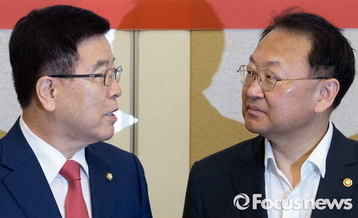 (서울=포커스뉴스) 21일 오전 서울 여의도 국회 귀빈식당에서 열린 2016년 세법개정 당정협의에 참석한 김광림(왼쪽) 새누리당 정책위의장, 유일호 경제부총리 겸 기획재정부 장관이 대화하고 있다.