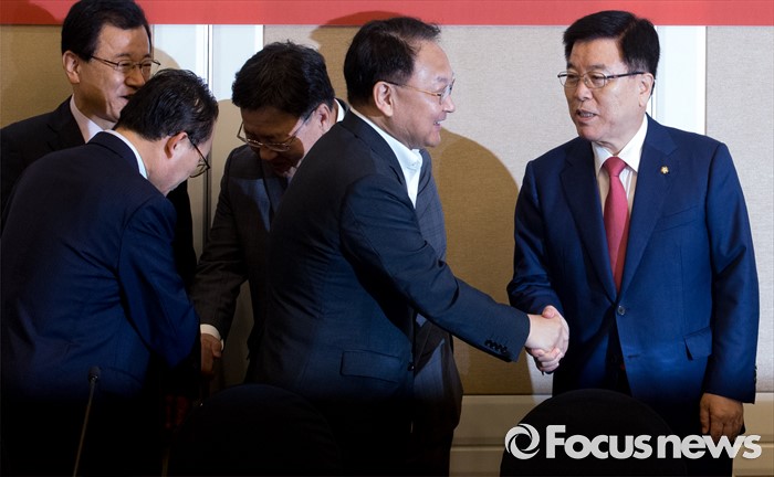 (서울=포커스뉴스) 21일 오전 서울 여의도 국회 귀빈식당에서 열린 2016년 세법개정 당정협의에 참석한 유일호 경제부총리 겸 기획재정부 장관과 김광림 새누리당 정책위의장이 인사하고 있다.