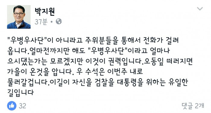 이어 "'우병우 사단'이라고 얼마나 으스댔는가는 모르겠지만 이것이 권력"이라며 "오동잎 떨어지면 가을이 온 걸 안다"고 덧붙였다.