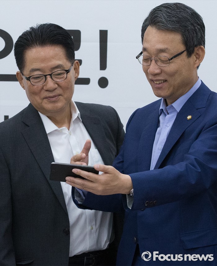 (서울=포커스뉴스) 21일 오전 서울 여의도 국회에서 열린 국민의당 원내정책회의에 참석한 박지원(왼쪽) 비대위원장과 김성식 정책위의장이 당사에서 진행 중인 사드배치 반대 필리버스터 온라인 방송을 핸드폰으로 시청하고 있다.