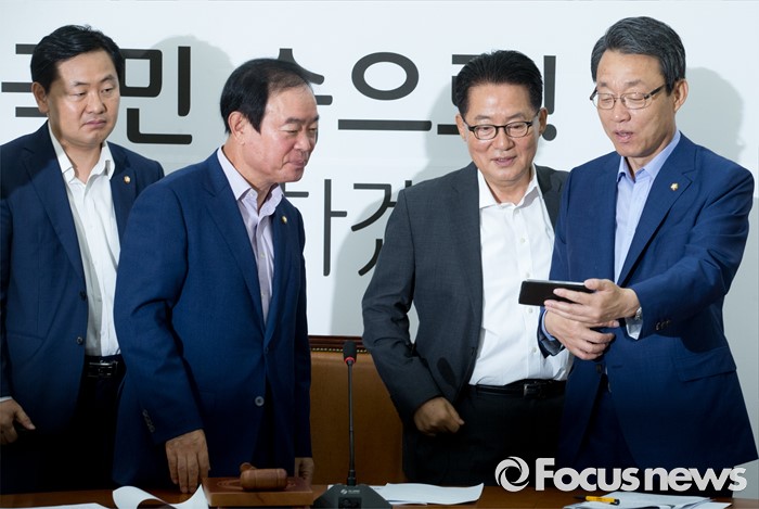 (서울=포커스뉴스) 21일 오전 서울 여의도 국회에서 열린 국민의당 원내정책회의에 참석한 박지원 비대위원장과 김성식 정책위의장 등 의원들이 당사에서 진행 중인 사드배치 반대 필리버스터 온라인 방송을 핸드폰으로 시청하고 있다. 왼쪽부터 김관영 원내수석부대표, 장병완 산업통상자원위원장, 박 비대위원장, 김 정책위의장.