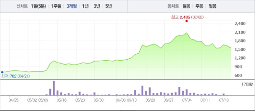 한편, 키스톤글로벌은 6일 열린 임시주주총회에서 정철웅 키위컴퍼니 대표이사를 신임 대표이사로 선임했다. 작곡가 겸 프로듀서인 김형석 씨는 키스톤글로벌의 신규 회장으로 선임됐다.주가흐름<사진출처=네이버 캡쳐>