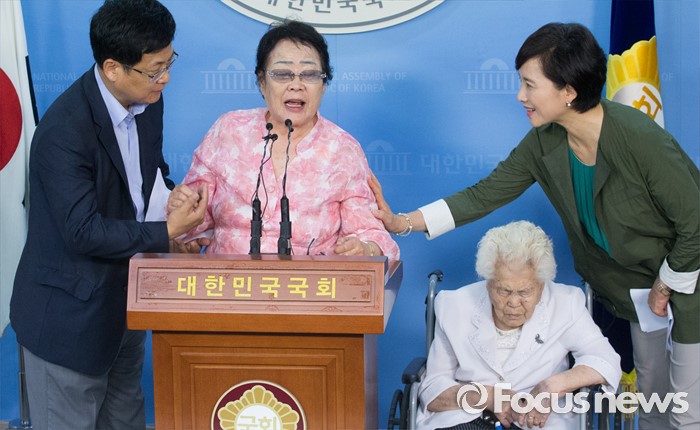 (서울=포커스뉴스) 21일 오전 서울 여의도 국회 정론관에서 열린 위안부 특별법 입법 청원 기자회견에 참석한 이용수(왼쪽 두번째) 할머니의 정부 비판 발언이 거세지자 최성(왼쪽 첫번째) 고양시장과 유은혜(오른쪽 첫번째) 더불어민주당 의원이 만류하고 있다.