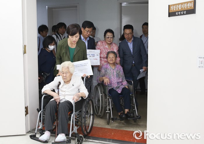 (서울=포커스뉴스) 21일 오전 서울 여의도 국회 정론관에서 유은혜 더불어민주당 의원, 최성 고양시장, 이용수, 박옥선, 이옥선 할머니 등이 위안부 특별법 입법 청원 기자회견을 마친 뒤 청원서를 제출하기 위해 민원실로 향하고 있다.