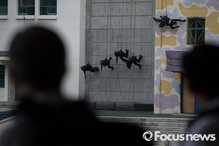 (서울=포커스뉴스) 김종인(왼쪽) 더불어민주당 비상대책위원회 대표와 안전행정위원들이 21일 오전 서울 서초구 경찰특공대를 방문해 대테러 훈련 시범을 참관하고 있다.