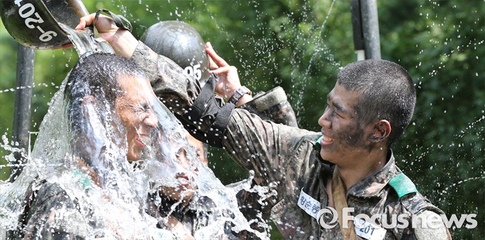 (논산=포커스뉴스) 폭염경보가 발령된 21일 충남 논산 연무읍 육군훈련소 각개전투종합훈련장에서 26교육연대 3교육대 훈련병들이 훈련을 받고 샤워를 하며 더위를 식히고 있다.