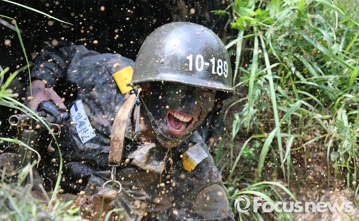 (논산=포커스뉴스) 폭염경보가 발령된 21일 충남 논산 연무읍 육군훈련소 각개전투종합훈련장에서 26교육연대 3교육대 훈련병이 훈련을 받고 있다.