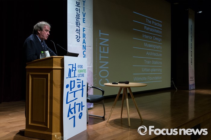 (서울=포커스뉴스) 인천공항을 설계했던 프랑스 건축가 장 미셸 빌모트가 21일 오후 서울 종로구 교보빌딩 컨벤션 홀에서 '토탈 디자인'을 주제로 강연하고 있다.