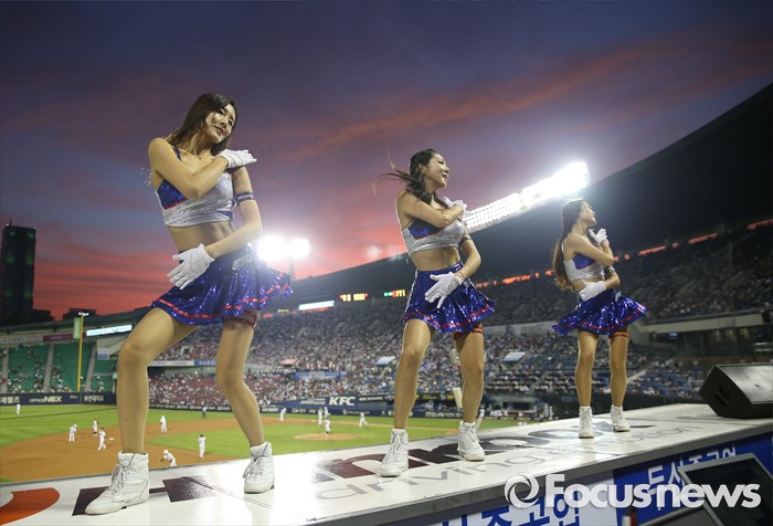 (서울=포커스뉴스) 21일 서울 잠실구장에서 열린 2016 프로야구 삼성-두산 경기에서 삼성 치어리더가 발간 노을이 떨어지는 한 여름밤의 무더위를 날려주는 시원한 춤을 관중들에게 선사하고 있다.
