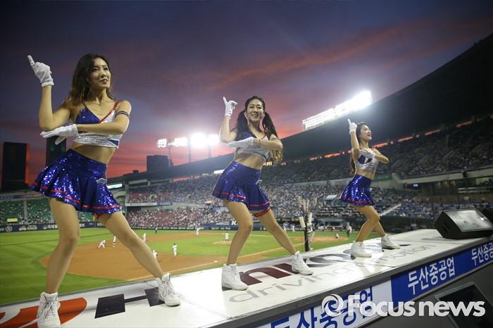 (서울=포커스뉴스) 21일 서울 잠실구장에서 열린 2016 프로야구 삼성-두산 경기에서 삼성 치어리더가 발간 노을이 떨어지는 한 여름밤의 무더위를 날려주는 시원한 춤을 관중들에게 선사하고 있다.