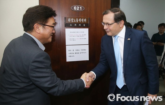 (서울=포커스뉴스) 22일 오전 서울 여의도 국회 환경노동위원회 소회의실에서 우원식 가습기살균제피해 국조특위 위원장과 찰스 헤이 주한 영국대사가 면담에 앞서 악수 하고 있다. 이날 면담은 가습기 살균제 피해자에 대한 영국 옥시사의 진정한 사과 및 관련자의 청문회 출석 요구에 관한 입장 전달 등을 위해 마련됐으며, 우원식 위원장을 비롯한 김상훈 새누리당 간사, 홍익표 더불어민주당 간사, 송기석 국민의당 간사, 이정미 정의당 의원 등이 참석했다.