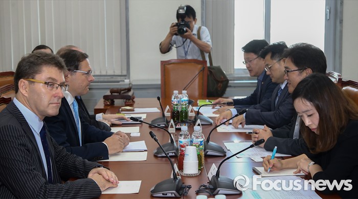 (서울=포커스뉴스) 22일 오전 서울 여의도 국회 환경노동위원회 소회의실에서 우원식 가습기살균제피해 국조특위 위원장과 찰스 헤이 주한 영국대사가 면담하고 있다. 이날 면담은 가습기 살균제 피해자에 대한 영국 옥시사의 진정한 사과 및 관련자의 청문회 출석 요구에 관한 입장 전달 등을 위해 마련됐으며, 우원식 위원장을 비롯한 김상훈 새누리당 간사, 홍익표 더불어민주당 간사, 송기석 국민의당 간사, 이정미 정의당 의원 등이 참석했다.