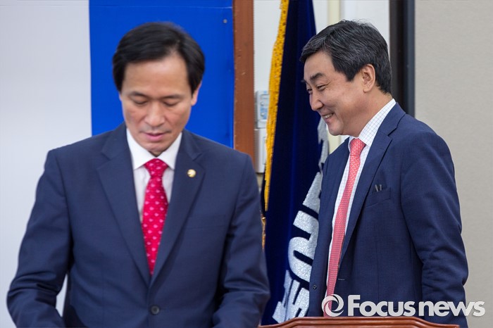 (서울=포커스뉴스) 우상호(왼쪽) 더불어민주당 원내대표와 이종걸 전 원내대표가 22일 오전 서울 여의도 국회에서 열린 비상대책위원회의에 참석하기 위해 회의실로 들어서고 있다.