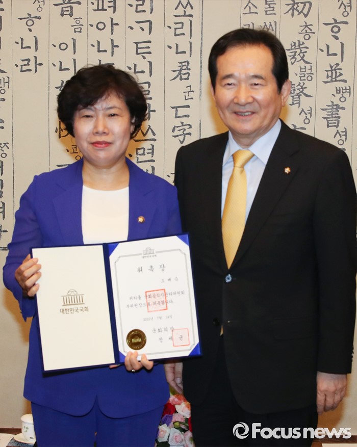 (서울=포커스뉴스) 22일 오전 서울 여의도 국회 의장접견실에서 열린 국회 공직자윤리위원회 위촉식에 참석한 정세균(오른쪽) 국회의장이 조배숙 부위원장에게 위촉장을 수여한 뒤 포즈를 취하고 있다.>