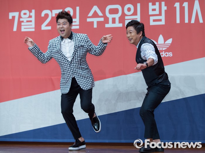 (서울=포커스뉴스) 22일 오후 서울 영등포구 63스퀘어에서 열린 Mnet '힛 더 스테이지' 제작발표회에 참석한 가수 전현무(왼쪽)와 이수근이 포토타임을 갖고 있다,