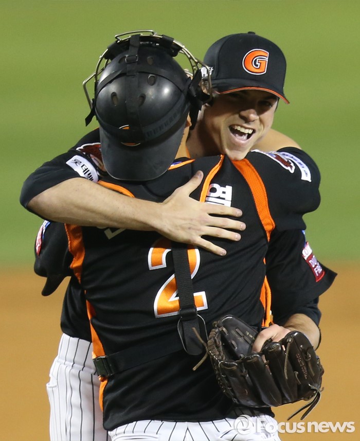 롯데는 지난 2011년부터 유니세프를 공식 후원하고 있으며 매월 마지막 금요일 홈경기를 통해 유니세프데이를 진행하고 있다.(서울=포커스뉴스) 14일 서울 잠실구장에서 열린 2016 프로야구 롯데-LG 경기에서 롯데 투수 레일리가 10탈삼진 무사사구 완봉승 거두고 포수 안중열과 포옹하고 있다. 2016.04.14 우정식 기자
