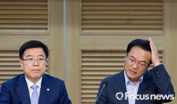 (서울=포커스뉴스) 22일 오후 서울 여의도 국회 의원회관에서 열린 '격차해소를 위한 해법, 왜 중향평준화인가?' 세미나에 참석한 정진석 새누리당 원내대표가 머리를 만지고 있다. 왼쪽은 김광림 정책위의장.