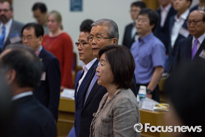 (서울=포커스뉴스) 야3당 대표가 22일 오후 서울 여의도 국회의원회관에서 열린 '5.18 왜곡 방지와 관련 법안 개정(처별규정) 위한 국민 토론회'에 참석해 애국가 제창 하고 있다. 왼쪽부터 박지원 국민의당 비상대책위원장, 김종인 더불어민주당 비상대책위 대표, 심상정 정의당 상임대표.