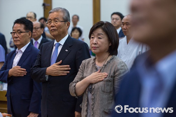(서울=포커스뉴스) 야3당 대표가 22일 오후 서울 여의도 국회의원회관에서 열린 '5.18 왜곡 방지와 관련 법안 개정(처별규정) 위한 국민 토론회'에 참석해 국민의례 하고 있다. 왼쪽부터 박지원 국민의당 비상대책위원장, 김종인 더불어민주당 비상대책위 대표, 심상정 정의당 상임대표.