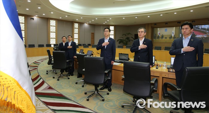 (세종=포커스뉴스) 22일 오후 세종시 정부세종청사 국무회의장에서 열린 임시국무회의에서 국무위원들이 국기에 대한 경례를 하고 있다.