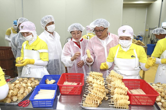 (옥천=포커스뉴스) 이동필 농림축산식품부 장관이 22일 충북 옥천군 옥천읍의 농식품 상생협력 우수업체인 '농업회사법인 회오리감자(유)'를 찾아 감자를 이용한 다양한 제품 생산과정을 둘러보고 있다. <사진제공=농림축산식품부>