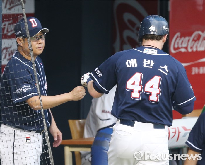 (서울=포커스뉴스) 22일 서울 잠실구장에서 열린 2016 프로야구 두산-LG 경기 2회초 1사 1루에서 두산 에반스가 좌월 2점 홈런을 치고 더그아웃에서 김태형 감독의 환영을 받고 있다.