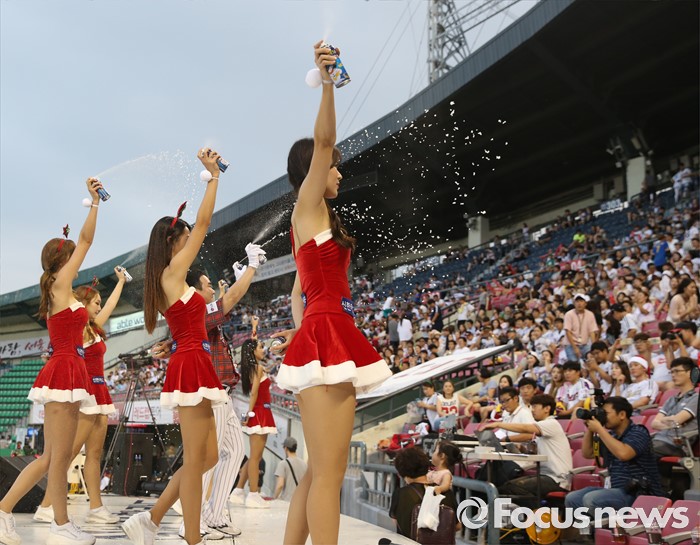 (서울=포커스뉴스) 22일 서울 잠실구장에서 열린 2016 프로야구 두산-LG 경기에서 LG 치어리더가 '섬머 크리스마스' 주제에 맞춰 산타 복장으로 눈스프레이를 뿌리며 한 여름의 더위를 식혀주고 있다.
