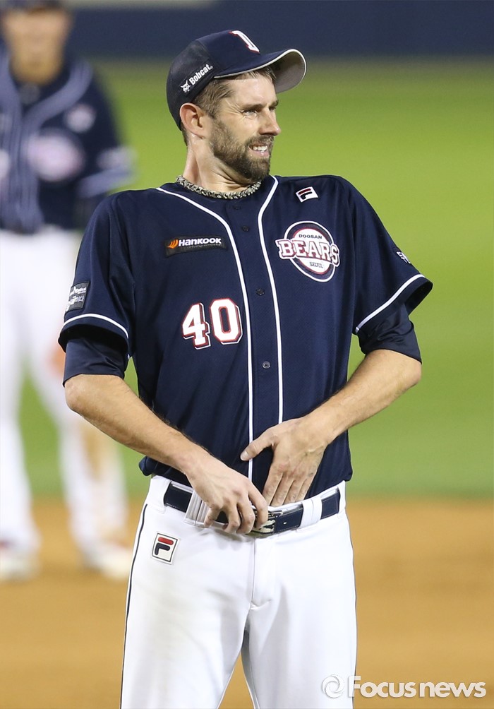 | △ 옷 매무새 고치는 두산 니퍼트 |